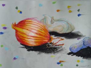 BG Stilleben: Meringue, Zwiebel, Nuss